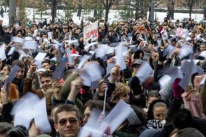 Students wave letters at the Supreme Public Prosecutor’s Office during a protest, demanding action from the state prosecutor Zagorka Dolovac in the case of the deaths of the victims in the Novi Sad railway station disaster in November, in Belgrade, Serbia, December 25, 2024. REUTERS/Djordje Kojadinovic