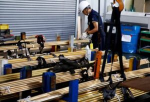 FILE PHOTO: A worker at Sakai Seisakusyo prepares to transport metal rods at its factory in Kakamigahara, central Japan, July 8, 2024. REUTERS/Anton Bridge/File Photo