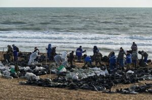 FILE PHOTO: Volunteers work to clear spilled oil on the coastline following an incident involving two tankers damaged in a storm in the Kerch Strait, in the settlement of Blagoveshchenskaya near the Black Sea resort of Anapa in the Krasnodar region, Russia December 21, 2024. REUTERS/Sergey Pivovarov/File Photo