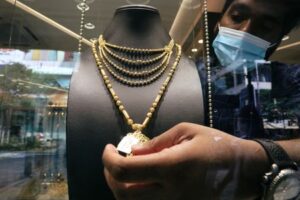 FILE PHOTO: A vendor wearing a protective mask arranges a gold necklace displayed at VJ Gold and Diamond jewellery shop in Kuala Lumpur, Malaysia August 10, 2020. REUTERS/Lim Huey Teng/ File Photo