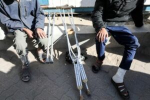 Wounded Palestinians, evacuated from Kamal Adwan hospital in northern Gaza after Israeli forces raided the medical facility, sit next to crutches, amid the ongoing conflict between Israel and Hamas, in Gaza City, December 28, 2024. REUTERS/Dawoud Abu Alkas