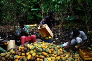 Farmers work at a cocoa farm in Sinfra December 30, 2024 December 30, 2024 FILE PHOTO: armers break cocoa beans at a farm in Sinfra, Ivory Coast Aril 29, 2023. REUTERS/Luc Gnago/File Photo