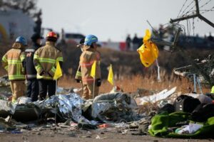 A life jacket hangs on fencing next to the wreckage of an aircraft that crashed after it went off the runway at Muan International Airport, in Muan, South Korea, December 29, 2024. REUTERS/Kim Hong-Ji