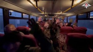 An image from a video, released by Russian Defence Ministry, shows what it said to be captured Russian service personnel in a bus following the latest exchange of prisoners of war at an unknown location in the course of Russia-Ukraine conflict, in a still image from video released December 30, 2024. Russian Defence Ministry/Handout via REUTERS