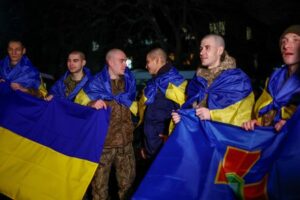 Ukrainian prisoners of war (POWs) wrapped with national flags return after a swap, amid Russia’s attack on Ukraine, in an undisclosed location in Ukraine, December 30, 2024. REUTERS/Valentyn Ogirenko