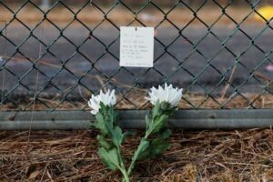 Flowers and a message of condolence laid by people working at the site where an aircraft went off the runway and crashed, are pictured at Muan International Airport in Muan, South Korea, December 30, 2024. REUTERS/Kim Soo-hyeon