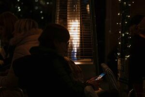 A tourist sits on a restaurant terrace as they shelter from the cold with a gas heater, which will be banned due to CO2 emissions from the first day of the new year, in Reial Square of Barcelona, Spain December 29, 2024. REUTERS/Bruna Casas
