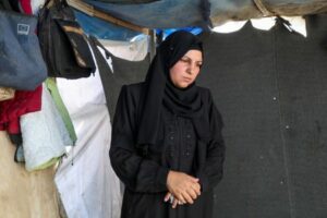 Noura, the mother of Palestinian infant Jumaa Al-Batran, who died of hypothermia after living in a tent with his displaced family, stands at their tent, in Deir Al-Balah in the central Gaza Strip, December 29, 2024. REUTERS/Ramadan Abed