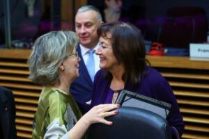 FILE PHOTO: European Commissioners Maria Luis Albuquerque and Dubravka Suica attend the first meeting of the new college of European Commissioners in Brussels, Belgium December 4, 2024. REUTERS/Yves Herman/File Photo