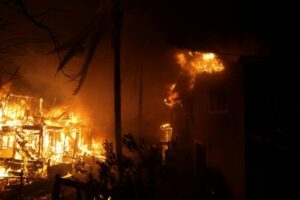 Flammen steigen aus einem Gebäude auf, während das Eaton-Feuer brennt in Pasadena, Kalifornien, USA, am 8. Januar 2025. REUTERS/Mario Anzuoni