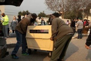 People arrive at the Pasadena Humane Society seeking shelter for their animals following wildfires, in Pasadena, California, U.S. January 8, 2025. REUTERS/Zaydee Sanchez
