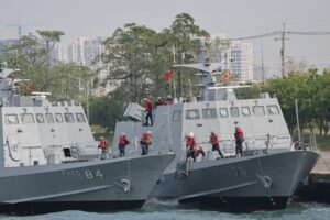 Navy personnel stand on board the Kuang Hua VI-class missile boats as the Taiwan military demonstrates combat readiness ahead of the upcoming Lunar New Year holidays as part of an annual exercise in Kaohsiung, Taiwan January 9, 2025. REUTERS/Ann Wang