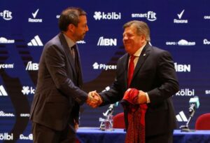 El director deportivo de la Federación Costarricense de Fútbol, Ignacio Hierro, da la bienvenida a Miguel Herrera como director técnico de la selección. Teatro Melico Salazar, San José, Costa Rica. 10 de enero de 2025.