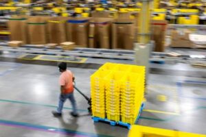 ARCHIV: Ein Arbeiter verschiebt Kartons während des Cyber Monday im Fulfillment Center von Amazon in Robbinsville, New Jersey, USA, 2. Dezember 2024. REUTERS/Eduardo Munoz/File Photo
