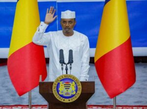 FILE PHOTO: Chad President Mahamat Idriss Deby raises his hand during his inauguration ceremony in N’djamena, Chad May 23, 2024. REUTERS/Israel Matene/File Photo