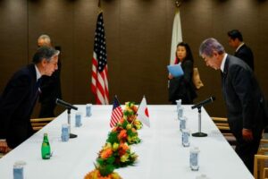 U.S. Secretary of State Antony Blinken and Japanese Foreign Minister Takeshi Iwaya take their seats for a working lunch at a hotel in Tokyo, Japan January 7, 2025. REUTERS/Issei Kato/Pool