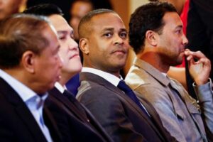 Newly appointed Indonesian national soccer team head coach Patrick Kluivert sits along with assistant coach Denny Landzaat and the Chairman of Indonesian National Soccer Association (PSSI) Erick Thohir, during a press conference in Jakarta, Indonesia, January 12, 2025. REUTERS/Willy Kurniawan