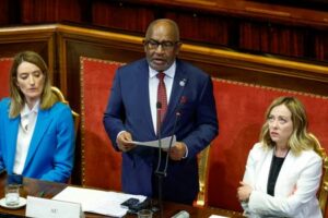 FILE PHOTO: Comoros President Azali Assoumani speaks next to Italy’s Prime Minister Giorgia Meloni and President of the European Parliament Roberta Metsola as Italy hosts an Italy-Africa summit, in Rome, Italy January 29, 2024. REUTERS/Remo Casilli/File Photo
