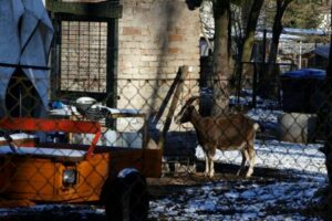 A goat, which will be killed today due to the outbreak of foot-and-mouth disease, stands on a farm in Schoeneiche, Germany, January 13, 2025. REUTERS/Axel Schmidt