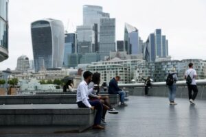 FILE PHOTO: People drink takeaway coffee in view of the City of London skyline in London, Britain, July 25, 2024. REUTERS/Hollie Adams/File Photo