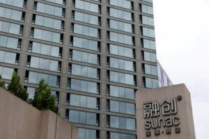 FILE PHOTO: The logo of property developer Sunac is seen outside a residential compound in Beijing, China September 19, 2023. REUTERS/Florence Lo/File Photo