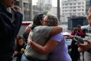 Imagen de archivo de Mabel Calderin, esposa de Carlos Correa, director de la ONG por la libertad de expresión Espacio Público,a braza a una persona durante un encuentro con los medios tras el arresto de su marido, en Caracas, Venezuela. 13 enero 2025. REUTERS/Leonardo Fernández Viloria