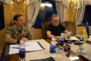 British Prime Minister Keir Starmer is briefed by his military assistant (name not given) on a train bound for Kyiv on January 16, 2025 in Ukraine. Carl Court/Pool via REUTERS