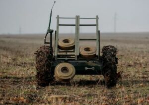 A mine-laying unmanned ground vehicle with anti-tank landmines installed on it operates in Kharkiv region amid Russia’s attack on Ukraine January 13, 2025. REUTERS/Sofiia Gatilova