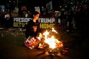 A demonstrator lights a torch as supporters and family members of hostages kidnapped during the deadly October 7, 2023, attack on Israel by Hamas, protest ahead of a ceasefire between Israel and Hamas, in Tel Aviv, Israel, January 16, 2025. REUTERS/Shir Torem