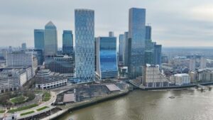 FILE PHOTO: A drone view of London’s Canary Wharf financial district, in London, Britain March 3, 2024. REUTERS/Yann Tessier/File Photo