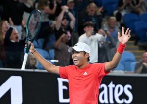 Tenis – Abierto de Australia – Melbourne Park, Melbourne, Australia – 16 de enero de 2025 Learner Tien, de Estados Unidos, celebra la victoria en su partido de segunda ronda contra el ruso Daniil MedvĂ©dev. REUTERS/Jaimi Joy