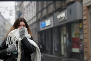 A woman covers her mouth while walking down the street amid dangerously high levels of air pollution in Sarajevo, Bosnia and Herzegovina, Januar 22, 2025. REUTERS/Amel Emric