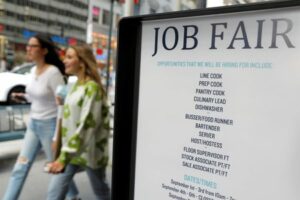 FILE PHOTO: Signage for a job fair is seen on 5th Avenue in Manhattan, New York City, U.S., September 3, 2021. REUTERS/Andrew Kelly/File Photo