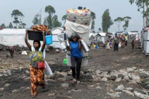Civilians carry their belongings as they flee from the Nzulo camp for the internally displaced to Goma, as fighting intensifies between the M23 rebels and the Armed Forces of the Democratic Republic of the Congo (FARDC), near Goma, Democratic Republic of Congo January 22, 2025. REUTERS/Arlette Bashizi