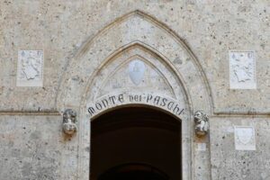 ARCHIV: Blick auf den Eingang zum Hauptsitz der Monte dei Paschi di Siena (MPS), der ältesten Bank der Welt, die im Rahmen einer geplanten Unternehmensfusion vor massiven Entlassungen steht, in Siena, Italien, 11. August 2021. Bild aufgenommen am 11. August 2021. REUTERS/Jennifer Lorenzini
