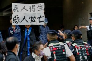 FILE PHOTO: Elsa, the foster mother of one of the defendants, social worker Hendrick Lui, holds a banner reading “The righteous shall live; the wicked shall perish” outside the West Kowloon Magistrates’ Courts building after the sentencing of 45 convicted pro-democracy activists charged under the national security law, in Hong Kong, China November 19, 2024. REUTERS/Tyrone Siu TPX IMAGES OF THE DAY/File Photo