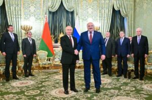 FOTO DE ARCHIVO. El presidente de Rusia, Vladimir Putin, estrecha la mano del presidente de Bielorrusia, Alexander Lukashenko, durante su reunión en el Kremlin en Moscú, Rusia. 9 de octubre 2024. Sputnik/Kristina Kormilitsyna/Sputnik vía REUTERS