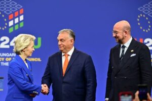 FOTO DE ARCHIVO. La presidenta de la Comisión Europea, Ursula von der Leyen, y el primer ministro de Hungría, Viktor Orbán, se dan la mano mientras el presidente del Consejo Europeo, Charles Michel, los observa tras una rueda de prensa durante la cumbre informal de la UE en el Puskas Arena, en Budapest, Hungría. 8 de noviembre de 2024. REUTERS/Marton Monus