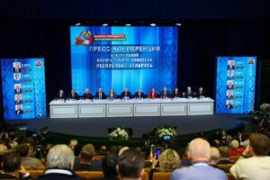 Members of Central Election Commission of Belarus attend a press conference on preliminary results of the presidential election, in Minsk, Belarus January 27, 2025. REUTERS/Evgenia Novozhenina