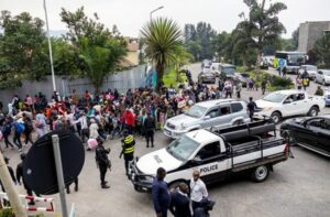 Rwandan security officers receive humanitarian staff and their families fleeing from Goma, eastern Democratic Republic of Congo, following fighting between M23 rebels and the Armed Forces of the Democratic Republic of the Congo (FARDC), in Gisenyi, Rwanda, January 27, 2025. REUTERS/Jean Bizimana