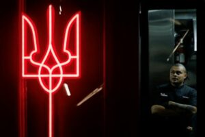 Spain’s viral chef Elias Dosunmu with over 20 million followers across all of his social media stands near the “Coat of arms of Ukraine” in the kitchen of his restaurant in Madrid, Spain, January 20, 2025. REUTERS/Juan Medina