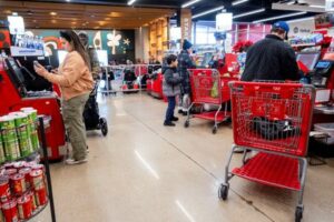 FILE PHOTO: Customers go through the self check out line at a Target store on the week of Black Friday shopping in Chicago, Illinois, U.S. November 26, 2024. REUTERS/Vincent Alban/File Photo