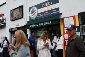 Personas que tenían una cita programada para el trámite de visa a Estados Unidos y les fue cancelado, esperan afuera de la embajada de EEUU por alguna información de reprogramación, en Bogotá, Colombia. 27 de enero de 2025. REUTERS/Luisa González