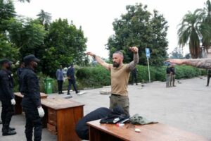 A Romanian mercenary undergoes screening as he is evacuated from Goma in the eastern Democratic Republic of Congo (DRC) amid a conflict between M23 rebels and the Armed Forces of the Democratic Republic of the Congo (FARDC), at the Grande Barrier border crossing, as seen from Gisenyi side of Rwanda, January 29, 2025. REUTERS/Thomas Mukoya