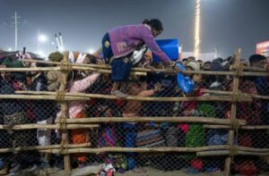 A devotee crosses over a barricade, after a deadly stampede before the second “Shahi Snan” (royal bath), at the “Maha Kumbh Mela” or the Great Pitcher Festival in Prayagraj, India January 29, 2025. REUTERS/Adnan Abidi