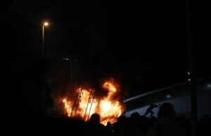 Soccer Football – Champions League – Manchester City v Club Brugge – Etihad Stadium, Manchester, Britain – January 29, 2025 A merchandise hut is seen on fire outside the stadium before the match REUTERS/Scott Heppell