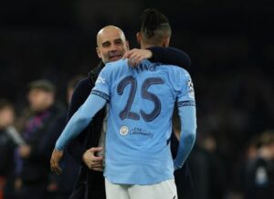 Soccer Football – Champions League – Manchester City v Club Brugge – Etihad Stadium, Manchester, Britain – January 29, 2025 Manchester City manager Pep Guardiola and Manuel Akanji celebrate after the match REUTERS/Phil Noble
