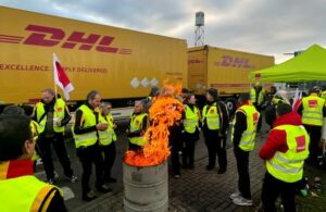 ARCHIV: Arbeiter stehen neben einer Feuertonne während eines bundesweiten Warnstreiks beim deutschen Postdienstleister Deutsche Post in Köln, Deutschland, 20. Januar 2023. REUTERS/Erol Dogrudogan