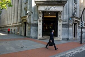 FILE PHOTO: A man walks past a branch of Spain’s BBVA bank in the Gran Via of Bilbao, Spain, May 9, 2024. REUTERS/Vincent West/File Photo