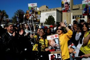 Varias personas reaccionan mientras ven la cobertura informativa previa a la liberación de los rehenes retenidos en Gaza desde el mortífero ataque del 7 de octubre de 2023, como parte de un acuerdo de alto el fuego en Gaza entre Hamás e Israel, en Tel Aviv, el 30 de enero de 2025. REUTERS/Shir Torem